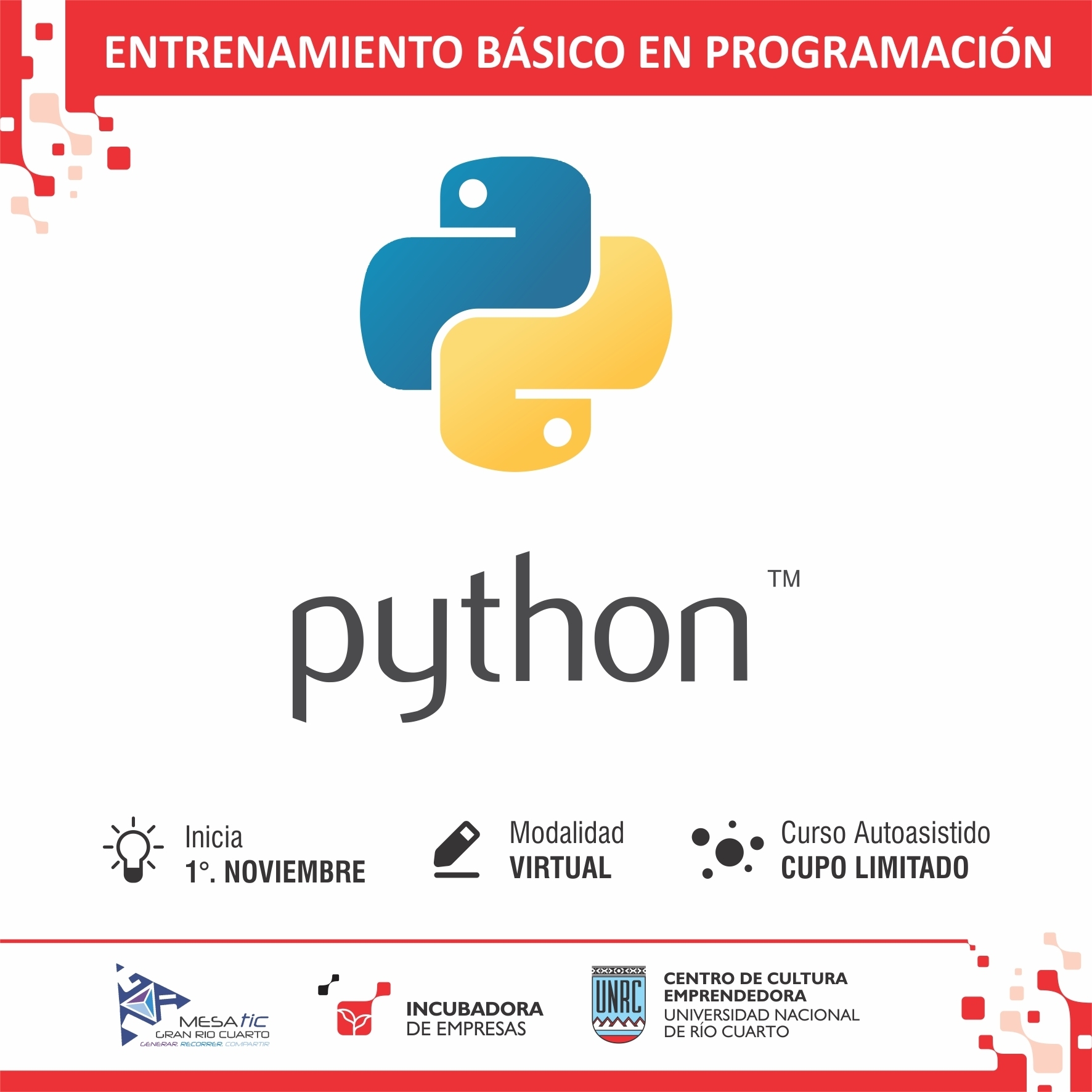 El curso está pensado para aprender los conceptos básicos e iniciales y del lenguaje de programación Python, una herramienta interesante y potente de programación, muy utilizado en Ciencia de Datos, Internet de las cosas (IOT) y desarrollo backend. Está destinado al público interesado en realizar los primeros pasos para aprender a programar con fines laborales.
