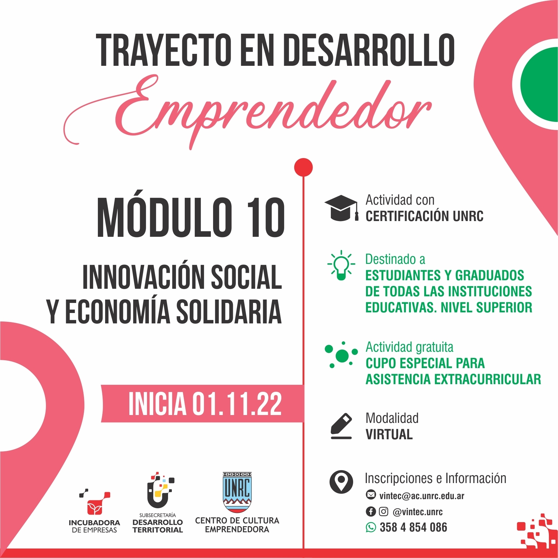 El Trayecto en Desarrollo Emprendedor, aprobado por RES.CS.121/19, es una iniciativa del  Centro de Cultura Emprendedora y la Incubadora de Empresas (UVT) de la UNRC, en consonancia con el Plan Estratégico Institucional (PEI). Promueve el desarrollo de habilidades y competencias para emprender, poner en marcha proyectos productivos, unidades de gestión cultural o emprendimientos colectivos, como cooperativas u ONG ‘s. Se configura también como un espacio de la UNRC para impulsar propuestas que atiendan las necesidades y complejidades de diferentes contextos de nuestra ciudad y región.