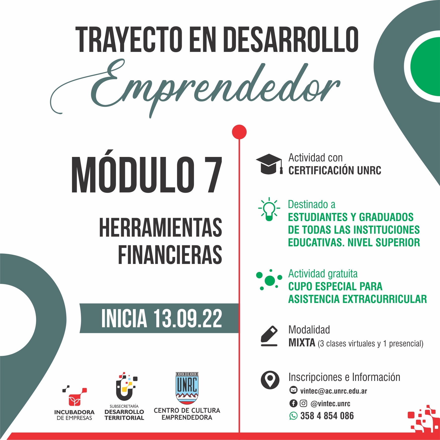 El Trayecto en Desarrollo Emprendedor, aprobado por RES.CS.121/19, es una iniciativa del Centro de Cultura Emprendedora y la Incubadora de Empresas (UVT) de la UNRC, en consonancia con el Plan Estratégico Institucional (PEI). Promueve el desarrollo de habilidades y competencias para emprender, poner en marcha proyectos productivos, unidades de gestión cultural o emprendimientos colectivos, como cooperativas u ONG ‘s. Se configura también como un espacio de la UNRC para impulsar propuestas que atiendan las necesidades y complejidades de diferentes contextos de nuestra ciudad y región.